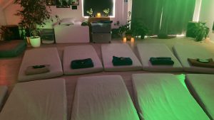 Dertil bevæger jeg mig rundt mellem madrasserne og deltagerne med forskellige lydgivere under Gong Badet.